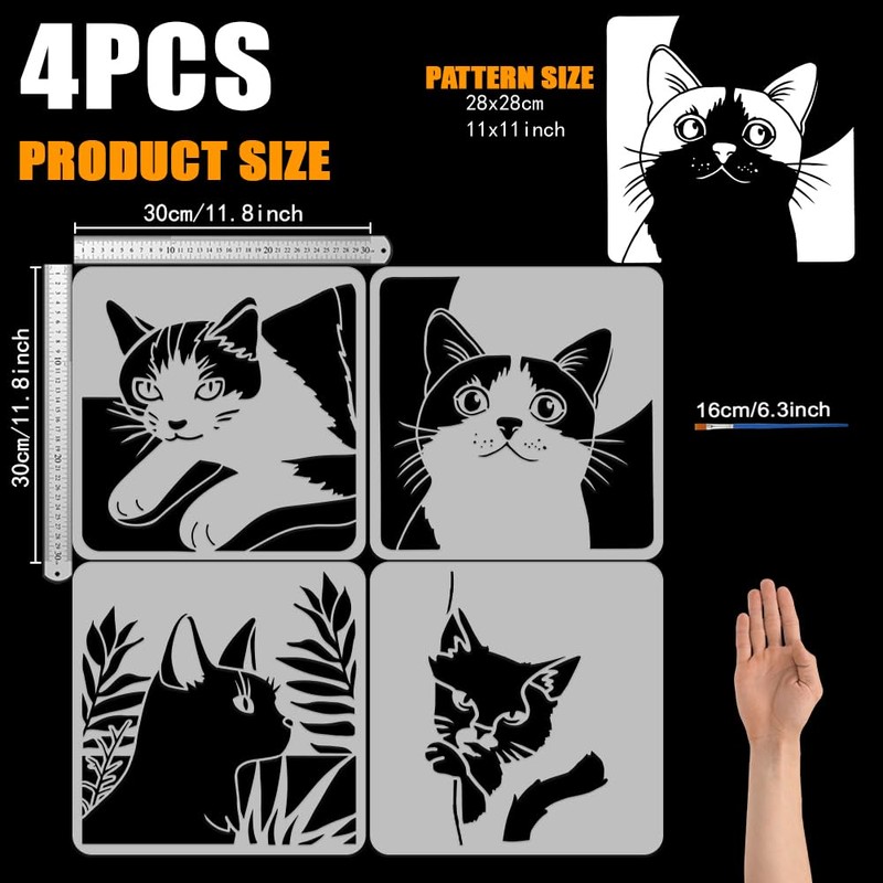 FINGERINSPIRE Pack of 4 Boho Stencils with Black Cat and Brush 30 x 30 cm Reusable Cute Cat Templates PET Painting Stencils with Peeping Cat Animal Motif Templates for Painting on Wood Fabric