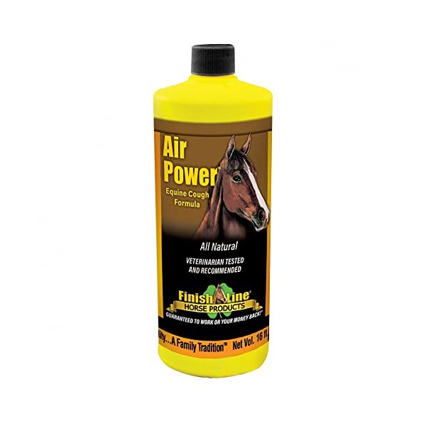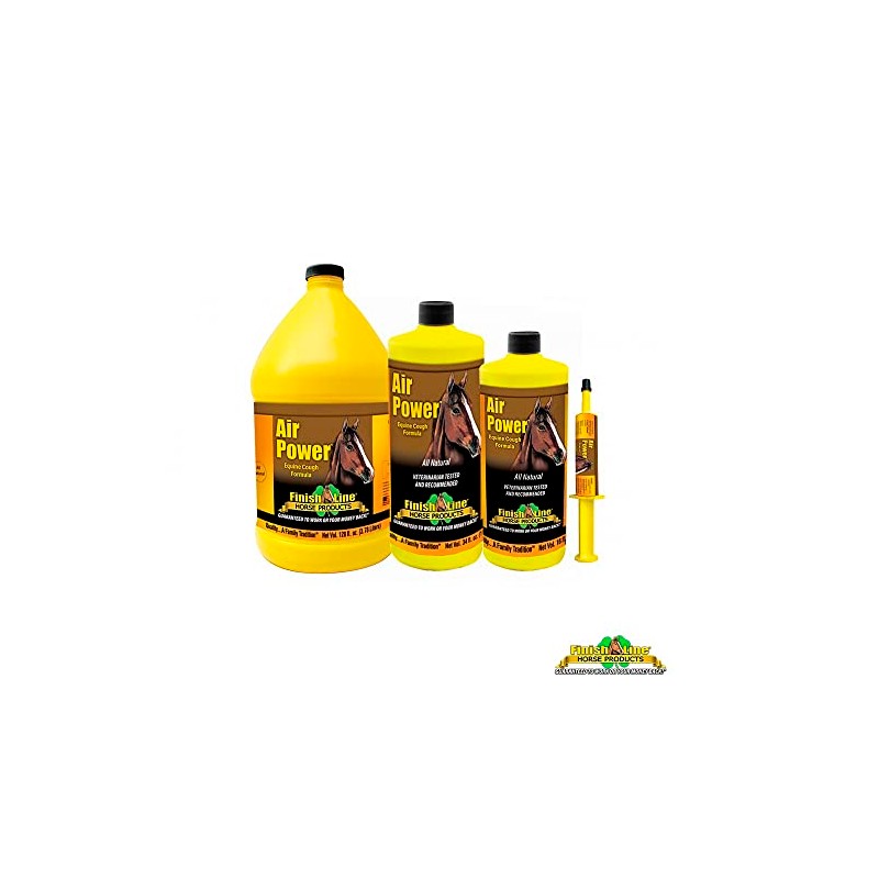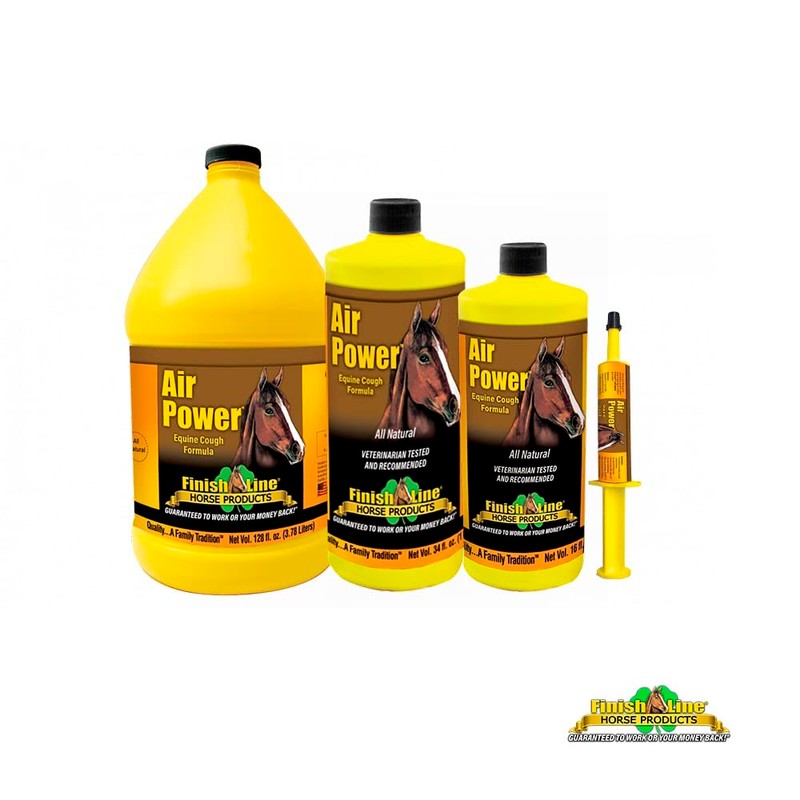 Finish Line(R) AIR POWER All natural cough formula. Usually, a single dosage of AIR POWER will help prevent a horse from coughing all day. It is safe for pre-event/race/performance, as it will not test. Also, cost efficient; you only use 25% the amount of AIR POWER compared to the usage needed with most other products. AIR POWER is the world's most effective cough formula and it is all natural. Item Specifications: Directions for Use: Shake well. Use an oral syringe. Administer 1/2 ounce (15cc) in the morning before morning exercise. Repeat 1/2 ounce (15cc) dosage in the late afternoon or evening if desired. Note: The single dose 1/2 ounce (15cc) size is pre-packaged in a single dose syringe.