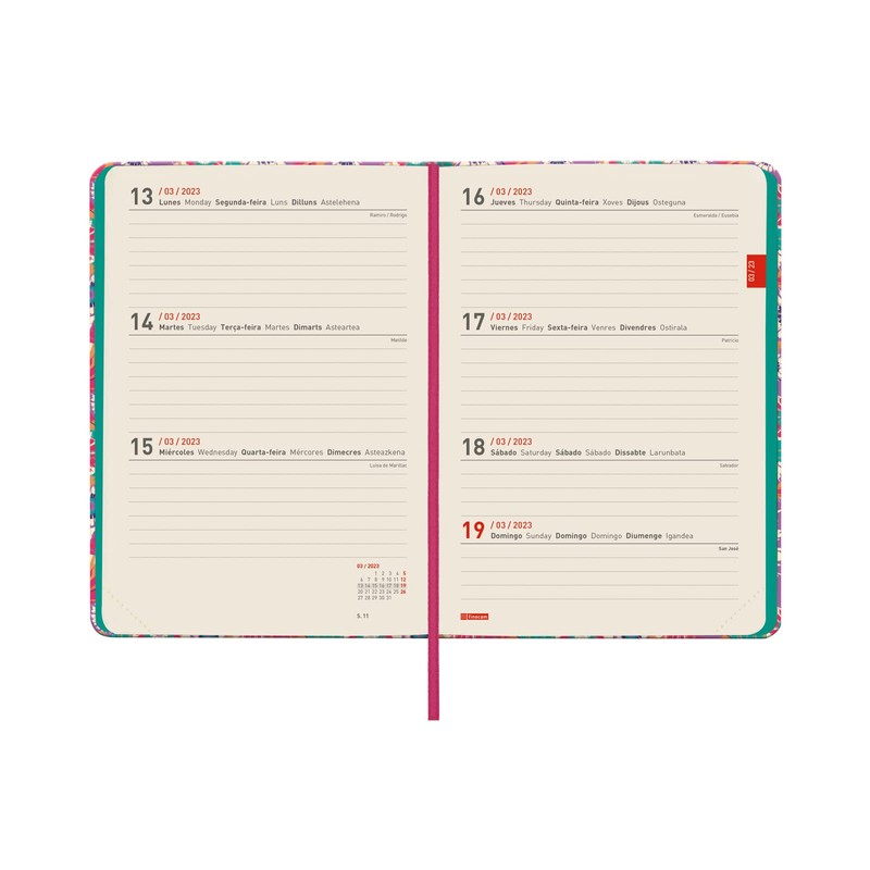 - Interior: Week Horizontal View. Full week view in horizontal allowing natural writing. Agenda in Spanish with multilingual annuity: Spanish, English, Portuguese, Galician, Catalan and Basque. With indication in the annuity of the holidays in Spain.