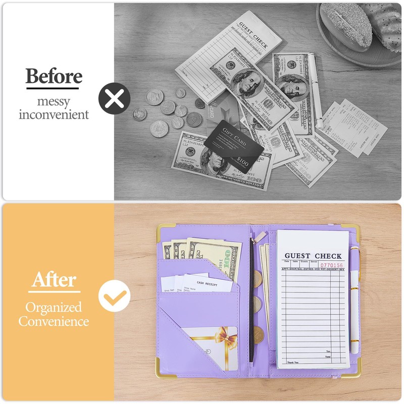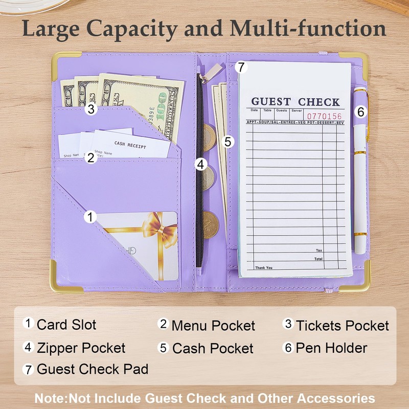 - Large Capacity: The waitress book organizer has multiple pockets and compartments, which can organize pen, guest check book, special menu, credit card, cash, checks; This server book is easy to keep organized and helps you run your serving shift smoothly with serving books