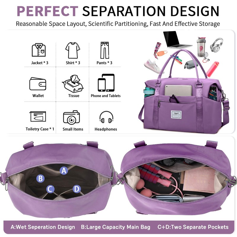FIORETTO Women's Travel Bag, Sports Bag, Hand Luggage, Weekender Bag, Swimming Bag, Waterproof Travel Bag, Duffle Bag, Fitness Bag, Training Bag for Women, lavender, 当代