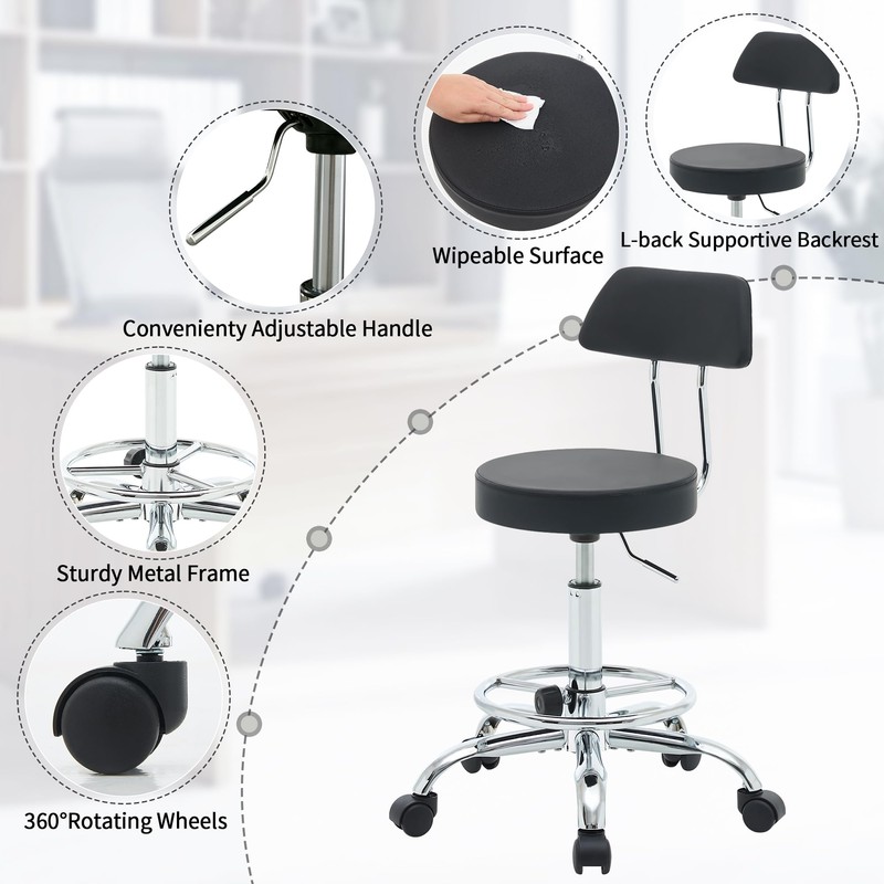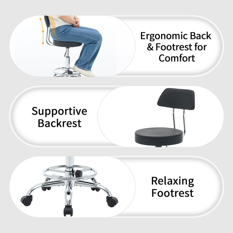 FIRAVOE Office Chair with Back (Adjustable Height Posture Stool 19.5’’-26.6’’)(Drafting Chair on Wheels) Work Stool with Footrest (Black)