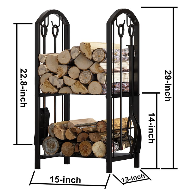 • ACCESSORIES: The fireplace wood rack with 4 tools holders can be well stocked with firewood and logs, rounded hooks design to protect children for all fireplace tools, poker, shovel, broom, tongs or fireplace bellows, and a steel shelf below the wood rack for fire starters, books, magazines, newspaper