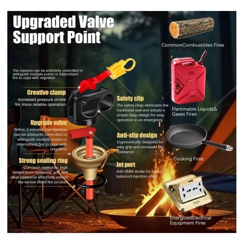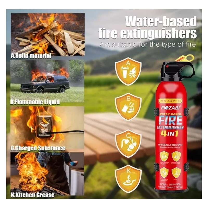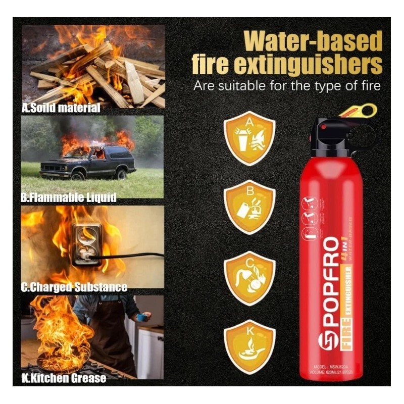 • Concentrated Water-based Fire Extinguisher:Maximum spray distance 13 feet, Suitable for Extinguishing Solid Material Fires, Combustible Liquid Fires, Electrically Charged Material Fires, Cooking Oil Fires.
