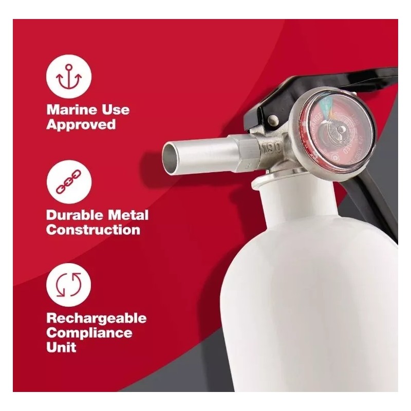 • Marine1 Fire Extinguisher is UL rated 1-A: 10-B: C; it features durable all-metal construction with a commercial-grade metal valve and trigger