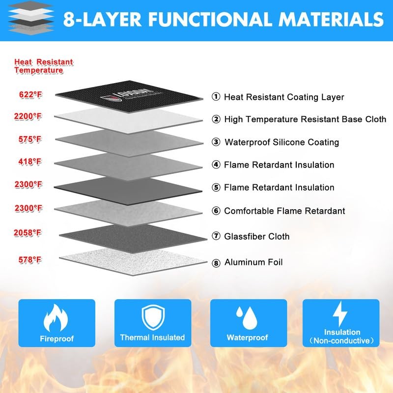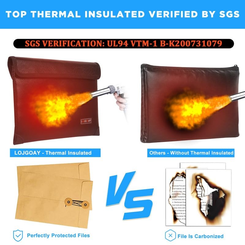 BEST FIREPROOF DOCUMENT BAGS : LOJGOAY fireproof document bags mainly adopts a 8-layer function material structure of fire protection and heat insulation, has passed Global Flammability Standards (US labs) and Vertical Combustion Testing (SGS UL94 V-1) and can withstand temperatures up to 5200°F. The middle layer of this fireproof file box is completely thickening thermal insulated cotton(Insulation 2718 ° F)