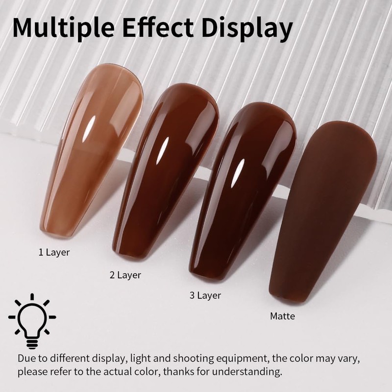 - Different Effect - Sheer translucent gel polish has a light color, applying thinly allows the color to become more even. Most importantly, its effect depends on your nail base color and the number of layers you apply ,one layer, two layers, and three layers are all different effects.