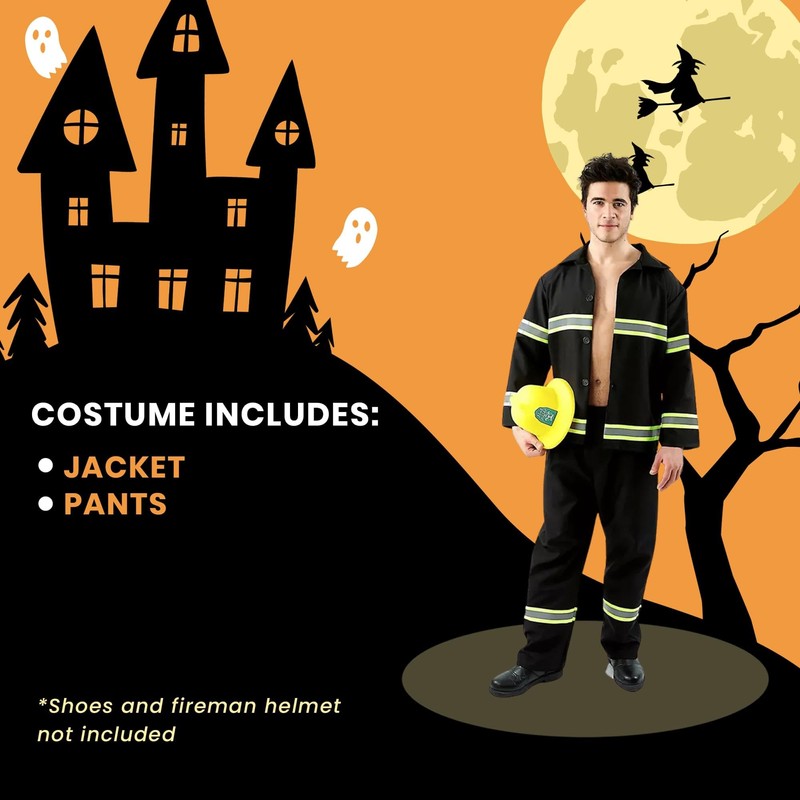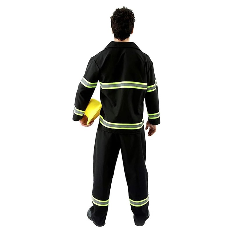 - COSTUME INCLUDES: A pair of black trousers and a matching jacket, both with reflective florescent strips. Trousers have an elasticated waistband. Excludes fireman helmet.