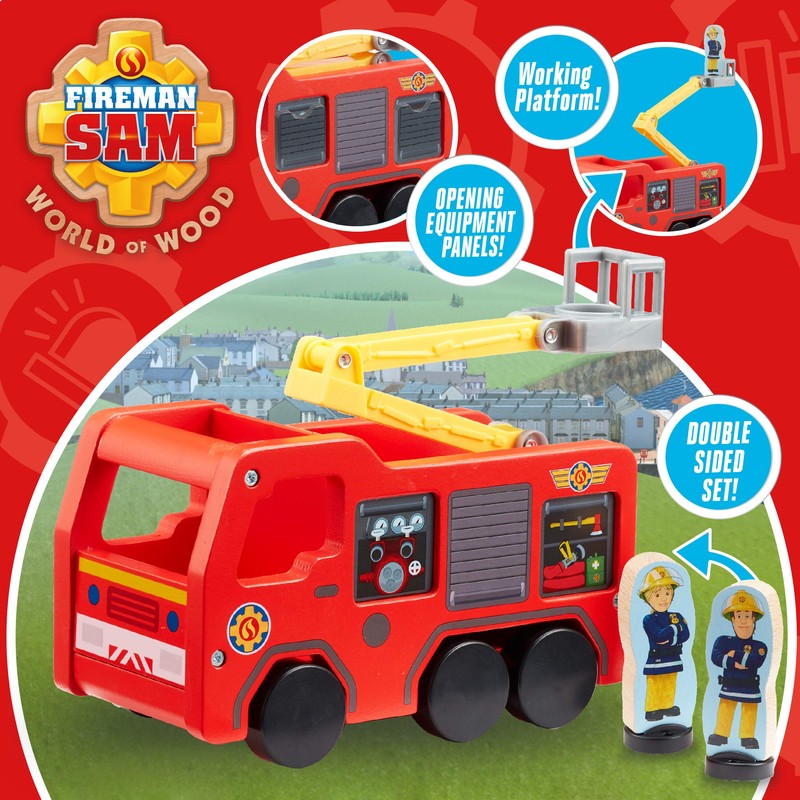 Fireman Sam Wooden Jupiter Free-Wheeling, Eco-friendly, FSC Wood Sustainable Pre-School Toy with Fireman Sam and Penny Two-Sided Figure, Red