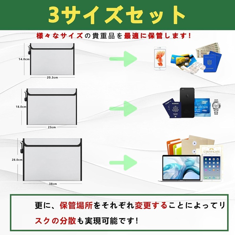 • Set of 3 sizes: L size: W 15.0 x H 11.2 inches (38.3 x 28.5 cm); M size: W 9.3 x H 7.1 inches (23.5 x 18 cm); S size: W 8.1 x H 5.5 inches (20.5 x 14.0 cm). It can properly store various sized valuables. By changing the storage location each one, you also have to disperse the risk