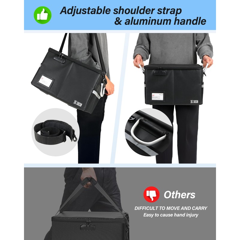 • Portable file box: safe box fireproof waterproof, it that not only has aluminum alloy handles, but we also come with a long strap to free up your hands,you can easily carry important documents, whether it's rainy or snowy day, travel, camping, business trips