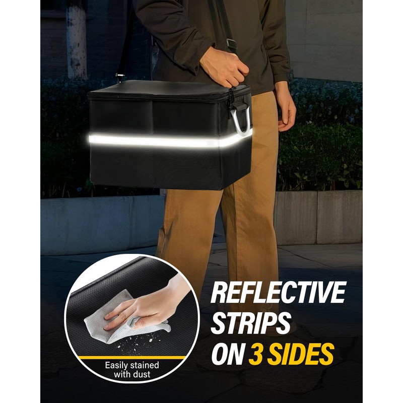• Third generation fire proof waterproof material: not easily stained with dust, easy to clean with a damp cloth when dirty,three sides with reflective strips , even walk on night roads, also increase safety,or in emergency, it will also be easy to find your safe box