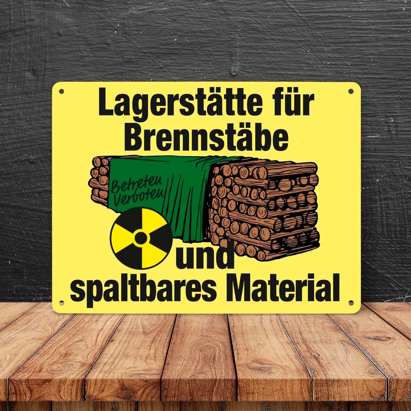 - The sign shows a pile of wood that is neatly stacked. There is a tarpaulin above the wooden warehouse. Above and below it is the wording: fuel rod deposit and fissile material.