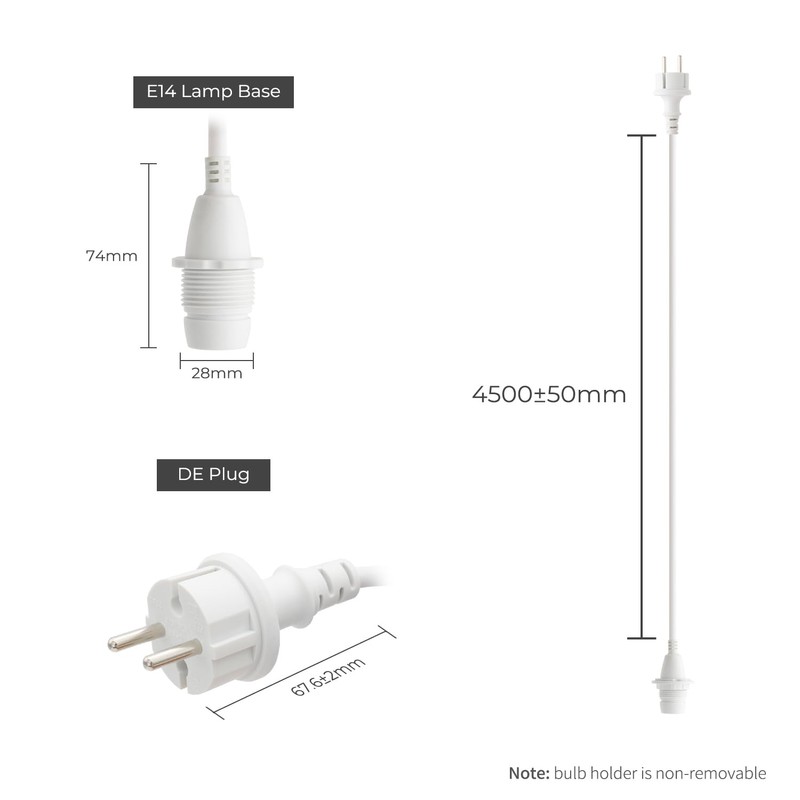 - Package includes: 1 x E14 bulb holder with rubber cable and plug; 4.5 metre long cable for longer distances to the power source