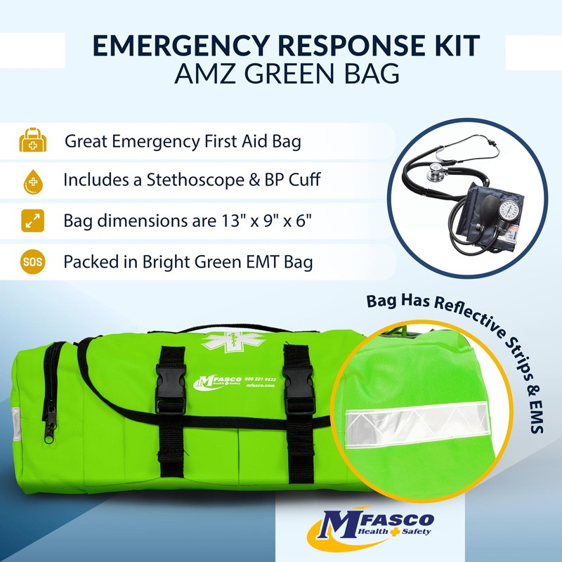 Introducing the MFASCO First Responder Kit, a newly updated 2019 edition with all the essentials for addressing first aid emergencies during earthquakes, tornadoes, or natural disasters. Packed in a sturdy, reflective bag, the kit includes a bleeding control products for trauma, Blood Pressure Cuff, Stethoscope, Non-Adhering Pads, Gauze Pads, Cold Pack, Emergency Blanket, Lister Scissors, Instant Glucose, Splinter Outs, Burn Gel, Self-Sticking Roll Bandage, First Aid Adhesive Tape, Gauze Rolls, Triangular Bandage, Multi Trauma Blood Stop Dressing, First Aid Guide Book, Nitrile Exam Gloves, Bandaid Strips, Spot Bandages, Knuckle and Fingertip Elastic Cloth Bandaids, Antibiotic Ointment, Antiseptic Wipes, Anti-Itch and Sting Kill Wipes, and PVP Iodine Swabs. Bag Dimensions: 13" x 9" x 6". Be fully prepared with the MFASCO First Responder Kit.