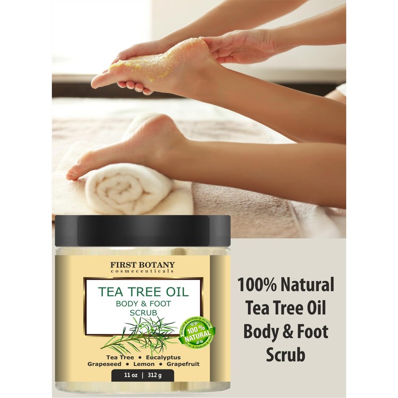 First Botany 100% Natural Tea Tree Oil Body & Foot Scrub with Salt - Best for Acne, Dandruff and Warts, Corns, Calluses, Athlete foot, Jock Itch & Body Odor