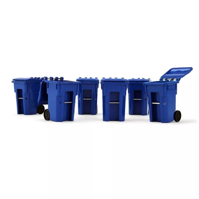 This authentic set of six trash carts diecast plastic replica model features an opening lid. Each are constructed out of sturdy plastic. This quality replica is decorated with a blue paint scheme. This 1/34 scale replica measures approximately 1.5" high.