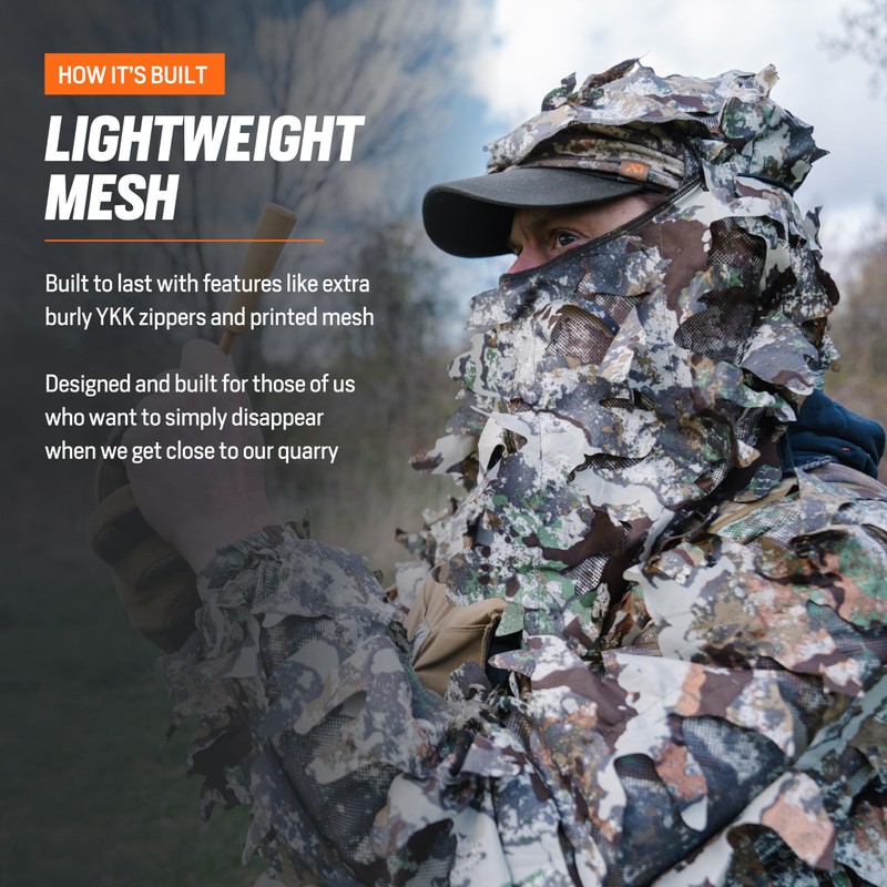 - Material: Mesh Cut: Cut to Wear Over Your Kit. Primary Uses: Spot & Stalk Tree Stand Waterfowl