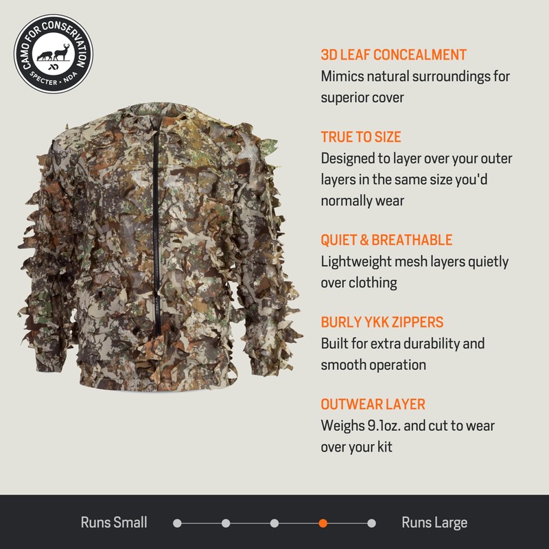 - True to Size: Designed to layer over your outer layers in the same size you'd normally wear Superior concealment via 3D leaf pattern, mimicking natural surroundings