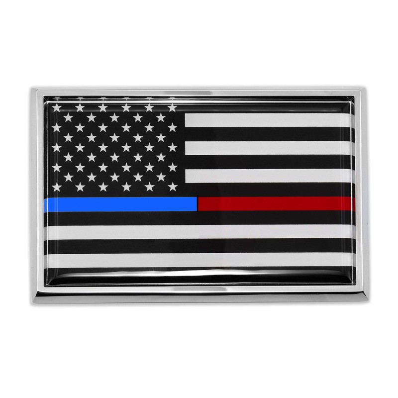 First Responder USA Flag shiny chrome auto emblem - (3.75” x 2.5” x .125”) by Elektroplate. This universal size is great for all applications. All-metal (NOT plastic) with a chrome-plated frame and a full-color domed decal insert. The decal is UV-protected with a laminated 1/8” thick PVC made to withstand any outdoor conditions. The emblem attaches via paint-safe 3M adhesive foam tape. All Elektroplate car emblems are comprised of a chrome-plated metal finish made to withstand harsh outdoor conditions. This auto emblem will look brand new for years to come (as opposed to cheap imitations that will fade or chip within months of being on your vehicle). Our high-end auto emblems are the perfect way to showcase your Police and Fire pride everywhere you drive. In addition, all Elektroplate chrome emblems are packaged in elegant retail packaging to make a great gift!