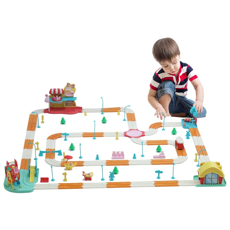 --- The train toy set includes a plush street scene map, combined with the cityscape for immersive play, ensuring comfort and durability for safe, enjoyable experiences.