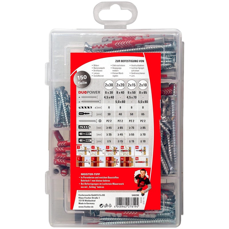 - Contents: 1 x Master Box DuoPower short/long dowel and screw set (item no. 540299), pre-sorted box with 150 DuoPower dowels and screws (30 x DuoPower 6 x 30 mm, 30 x PZ countersunk screw 4.5 x 40 mm, 20 x DuoPower 8 x 40 mm, 20 x PZ countersunk screw 5.0 x 60 mm, 15 x DuoPower 6 x 50 mm, 15 x PZ chipboard screw 4.5 x 70 mm, 10 x DuoPower 8 x 65 mm, 10 x PZ chipboard screw 5.0 x 80 mm) by fischer.