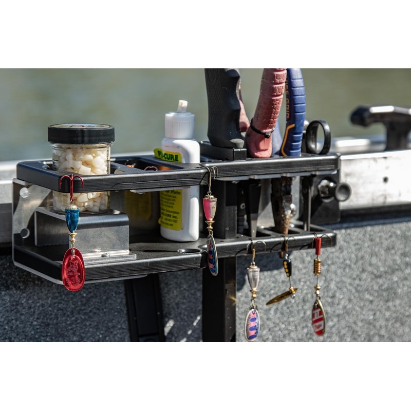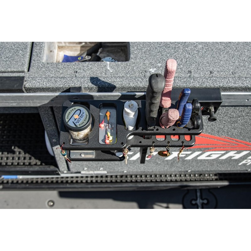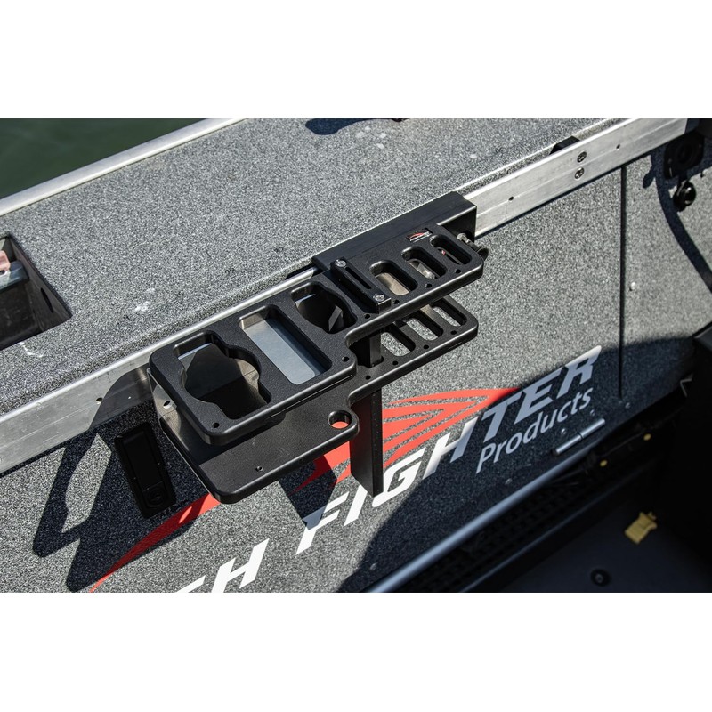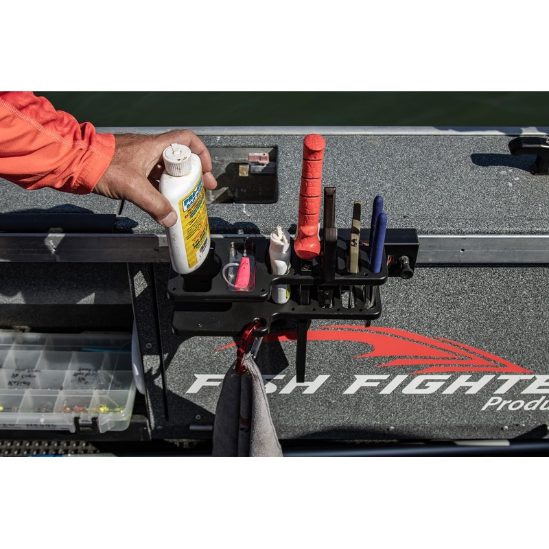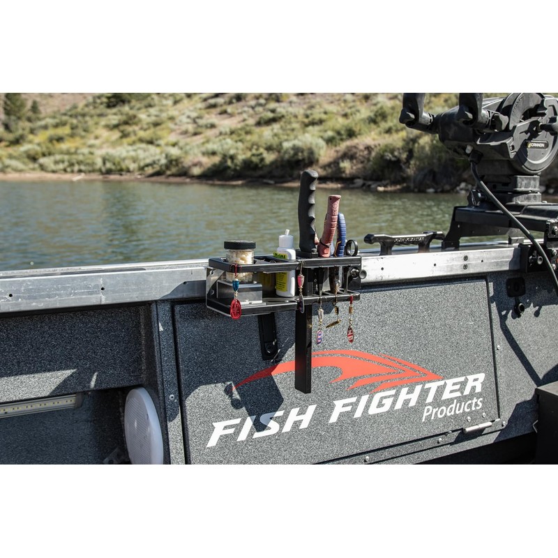 Stay Organized & Enhance Your Catch with the Fish Fighter Knife & Plier Organizer with Scent Station! Keep all your fishing essentials organized and readily accessible with this premium organizer from Fish Fighter! This multi-functional solution is crafted from marine-grade aluminum and King Starboard plastic, ensuring long-lasting durability for even the most dedicated anglers. Maximize Efficiency and Convenience Integrated Scent Station: Features multiple compartments to hold various popular scent bottle sizes, including round bottles, small bottles, and larger Pro-Cure bottles. A removable spacer keeps smaller containers like Crappie Nibbles or salmon eggs within easy reach. Movable Knife Holder (up to 9" blades): Mounts on either side and includes a drainage slot for cleaning and rust prevention. Built-in Tray: Perfect for storing extra swivels, beads, jig heads, or other small items you need close at hand. Tool Slots: Designed to hold pliers, scissors, and crimpers with an open back for easy access, visibility, and air drying to prevent rust and corrosion. Hook Holders: Keep a few extra hooks handy for quick lure changes without opening your tackle box. Bait Towel Clip: Conveniently hang your Fish Fighter Bait Towel (sold separately) to keep your hands clean. Multiple Mounting Options for Easy Installation This organizer boasts various mounting options to fit your needs. Mount it directly to any flat surface using the laser-cut holes. Alternatively, if you have a Fish Fighter Sliding Rail System (SRS), you can easily bolt it directly to the SRS block. Built to Withstand the Elements Constructed with high-quality, corrosion-resistant materials, this organizer is built to endure the harsh marine environment. The .125" thick aluminum frame provides rigidity, while the CNC machined Marine King Starboard plastic tool slots offer added functionality and lasting performance. Invest in Organization, Efficiency, and Bigger Catches! Order Your Fish Fighter Knife & Plier Organizer with Scent Station Today!