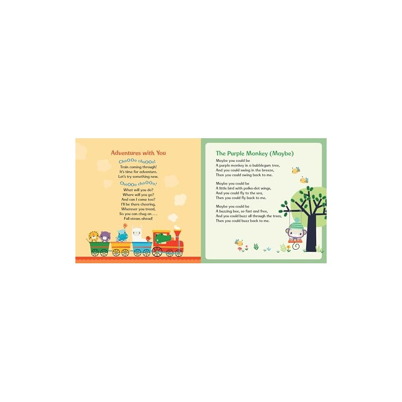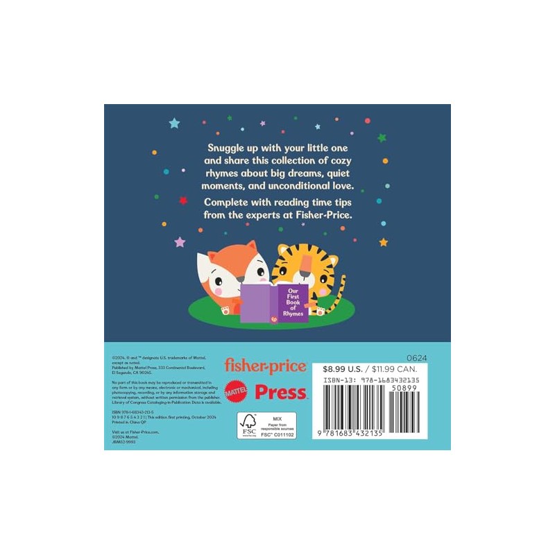 Give little ones a head start with this collection of rhymes, designed to foster cognitive development and deepen parent-child bonds. Featuring Fisher-Price's viral Purple Monkey song and complete with expert tips for reading time, this board book offers warmth, fun, and learning for babies and grownups alike.Developed by Fisher-Price, the most successful childhood brand in the world.Inspired by Fisher-Price's viral "Purple Monkey" song, this collection of twelve sweet and silly rhymes was crafted with early childhood milestones in mind. Calming, rhythmic sounds keep babies engaged while images of playful animals spark their curiosity. Caregivers will delight in sharing these messages of big dreams, quiet moments, and unconditional love, creating lasting memories them and their little ones. Whether it's bedtime, downtime, or just us time, flip through the pages to find the perfect rhyme or enjoy reading the whole book in one go!Get the most out of reading time with practical tips from the experts at Fisher-Price. From advice on reading aloud to strategies for keeping little ones engaged, these insights help parents and caregivers encourage early childhood literacy and pave the way for a life-long love of reading.From little moments to big milestones, Fisher-Price is dedicated to helping families throughout every age and stage.