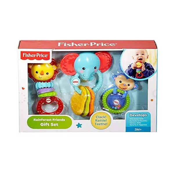 ​Your newborn will go wild with all the fun sounds, colors and textures on these adorable toys that also help give developing senses and skills a boost. The lion rattle is a roaring good time with fun, textured clackers and a ring for easy grasping and shaking. The monkey rattle, with colorful beads that reward baby's shake and a tail to use as a link, is sure to hang around for a while. The elephant teether is cute and fun, with textured ears and peanuts designed for teething and clacking, too.