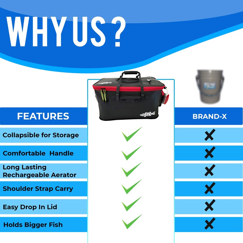 Want something easy to carry and easy to store away? We redesigned our original bucket to give you this innovative foldable fishing bucket where you can now easily pop the fish in and they cannot jump out! Take the hassle out of opening and closing lids. Designed to keep your catch healthy and alive all day with our eco-friendly rechargeable aeration pump. Alternatively, it can also be a bait bucket to keep your bait fish fresh and feisty.