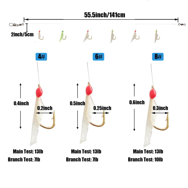 - Package Include - 9packs(54pieche),each pack with 6 hooks,hook size 4#,6#,8#.Ideal for catching mackerel, small jacks, herring, smelt and other bait fish.