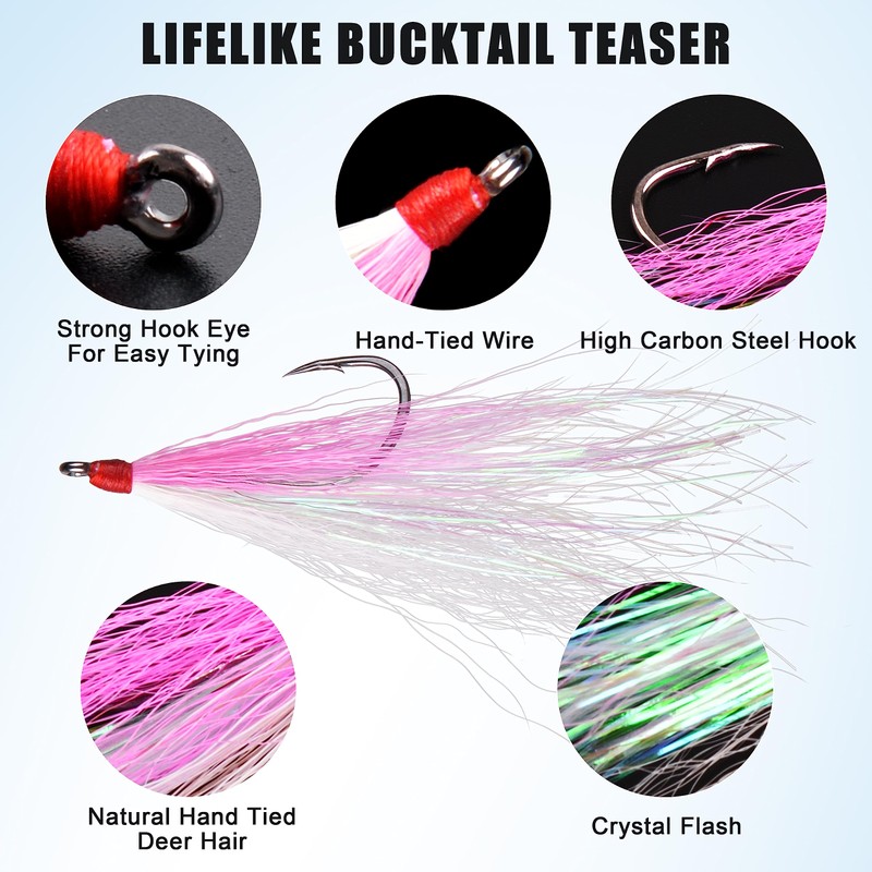 ATTRACTIVE: Bucktail teasers hook is made with genuine bucktail, added flashing pearl mylar make the lure dynamic look underwater.