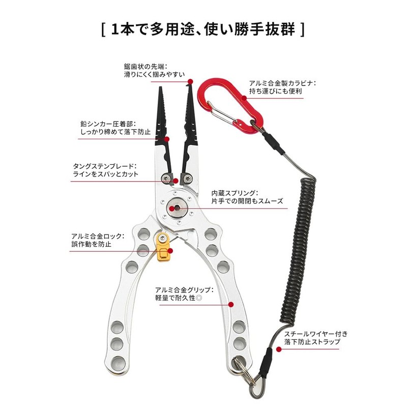 This product combines all the functions necessary for fishing such as hook removal, line cutting, split ring opening, sinker crimping, and fish gripping aid. All you need to do tedious work smoothly and maximize your fishing enjoyment.