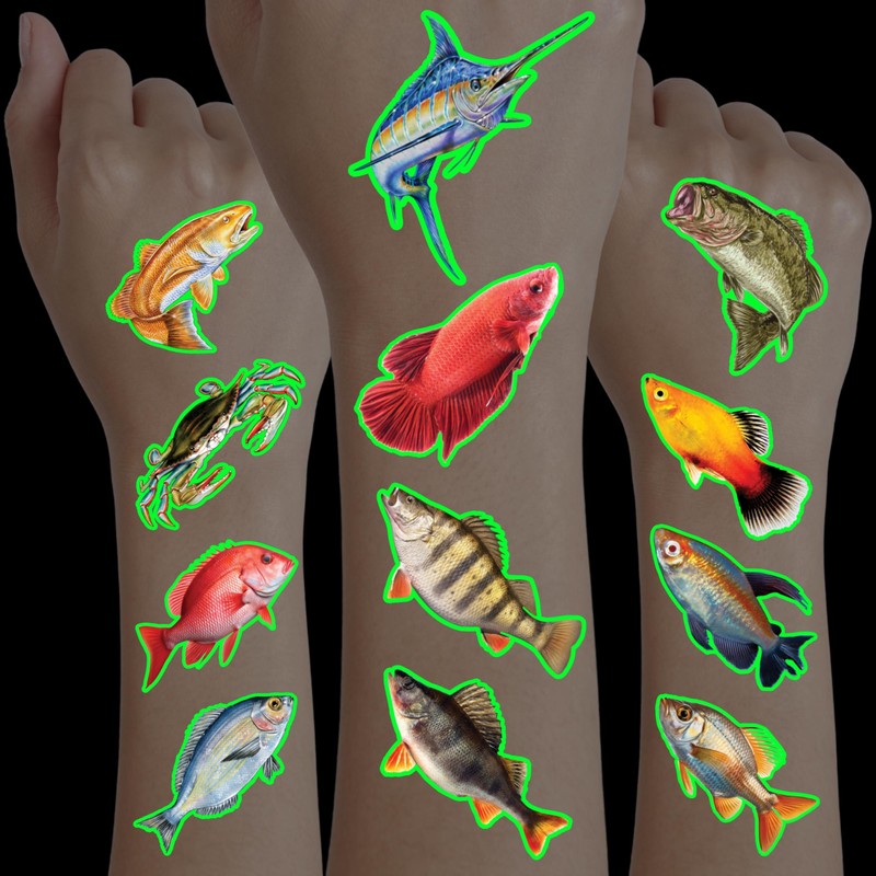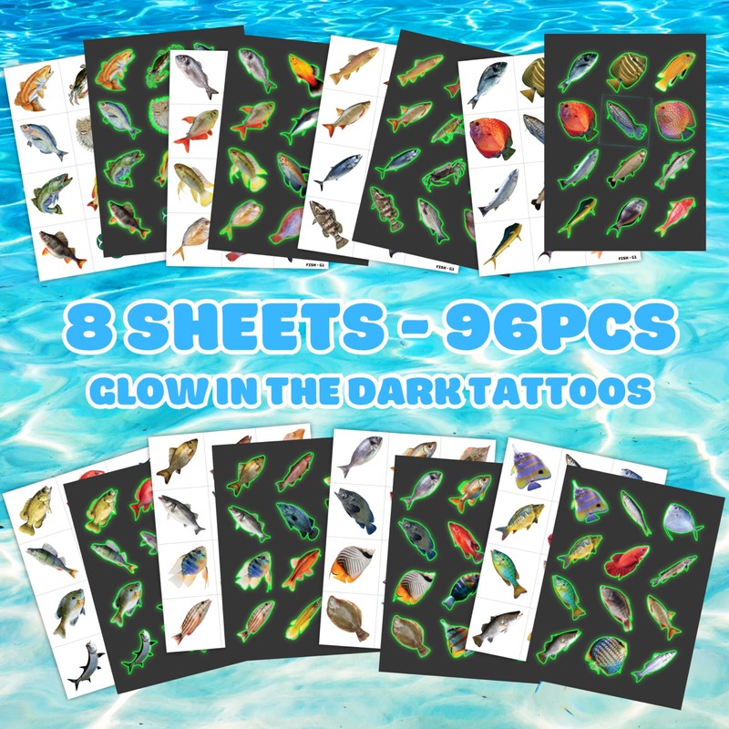 Fishing Temporary Tattoos - Fish Lake 96 PCS Funny Fish Themed Stickers for Kids Birthday Party Supplies, Decorations, Favors and Prizes - Glow in the dark