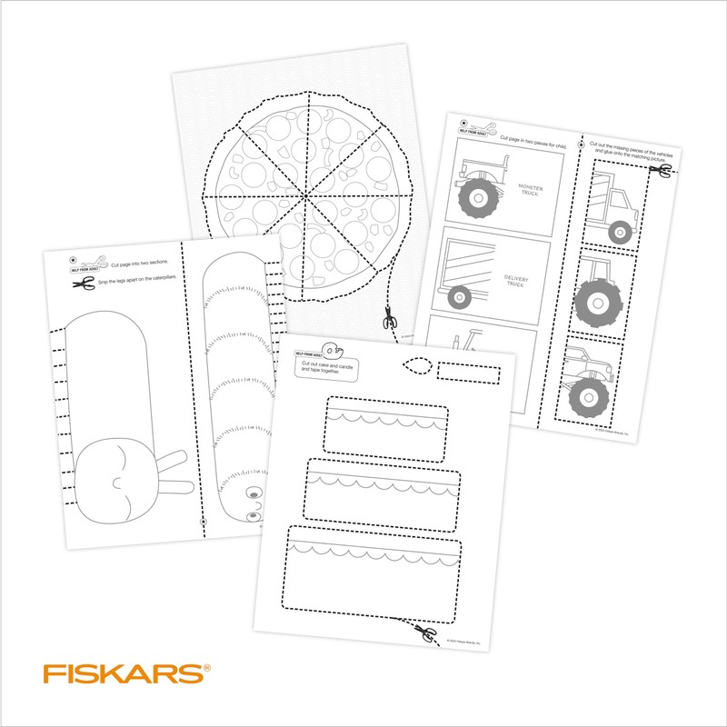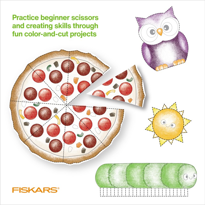 - Fiskars Training Scissors & Activity Book (Ages 3+) includes training scissors and 30 pages of activities, along with tips and tricks to help young kids learn scissors skills