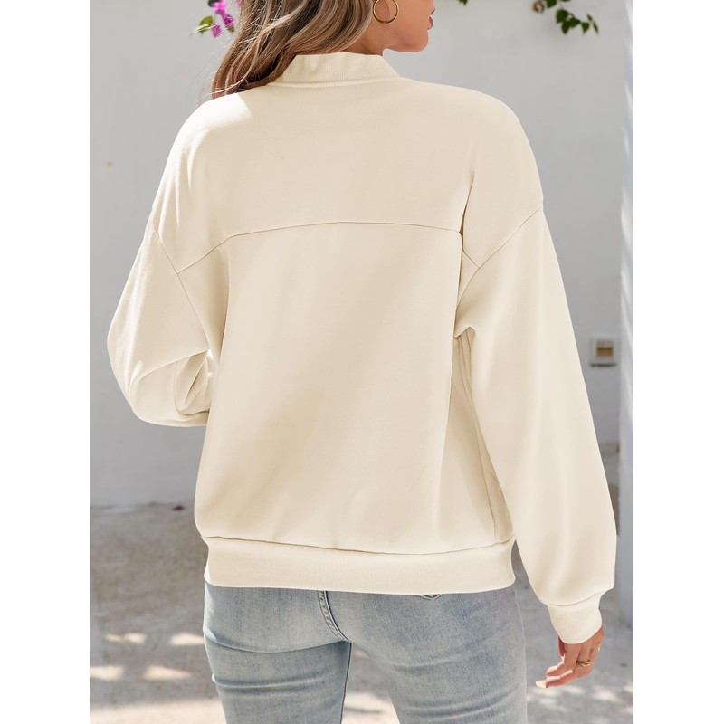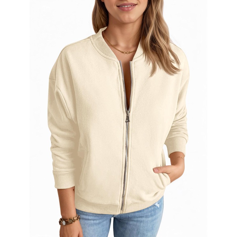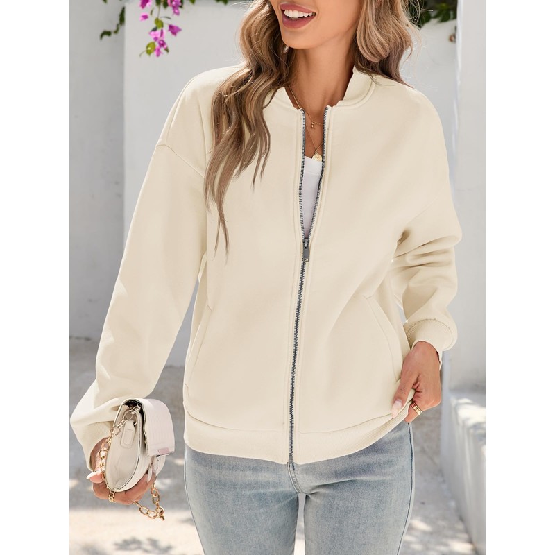 Fisoew Womens Zip Up Long Sleeve Sweatshirt Jacket Casual Loose Coats With Pockets Beige