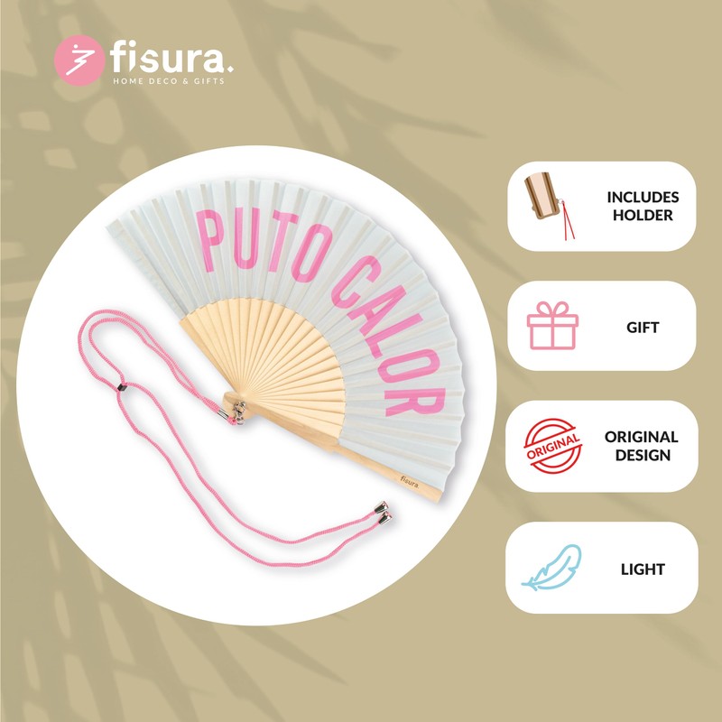 Fisura - Original handheld folding fan with the message in Spanish. Wooden fan. Original holding Hand Fans. Fan with hanger included (Calor, grey and pink)