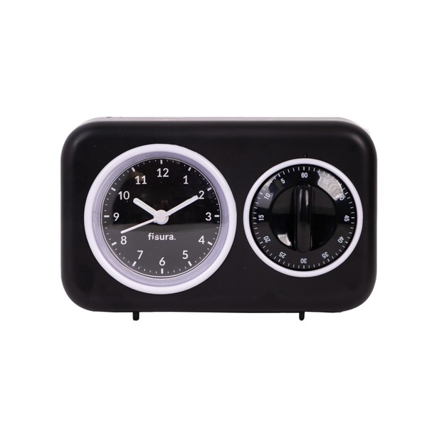 Fisura - Retro kitchen timer black. Analogue kitchen timer for 60 minutes. Multifunctional timer with clock and alarm function. Original timer. Pomodoro timer.
