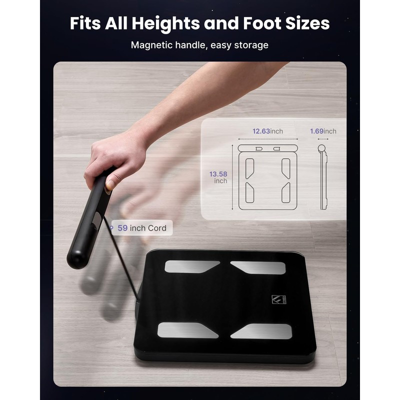 - [Convenient & Durable] The all-in-one display shows seven basic indicators at a glance. Featuring a minimalist design with a retractable handle for easy storage, it includes a 59-inch long line suitable for users of all heights. The scale's black 6mm tempered glass and ABS black bottom shell ensure durability and stability. The body fat scale is the perfect combination of convenience and durability (Tips: Gravity startup 11-15 lb)