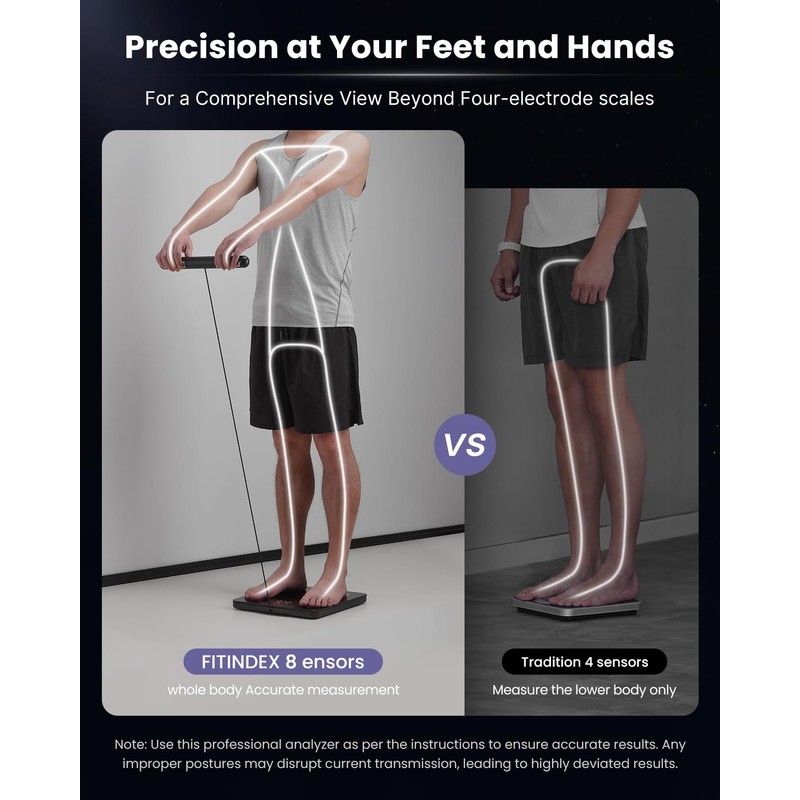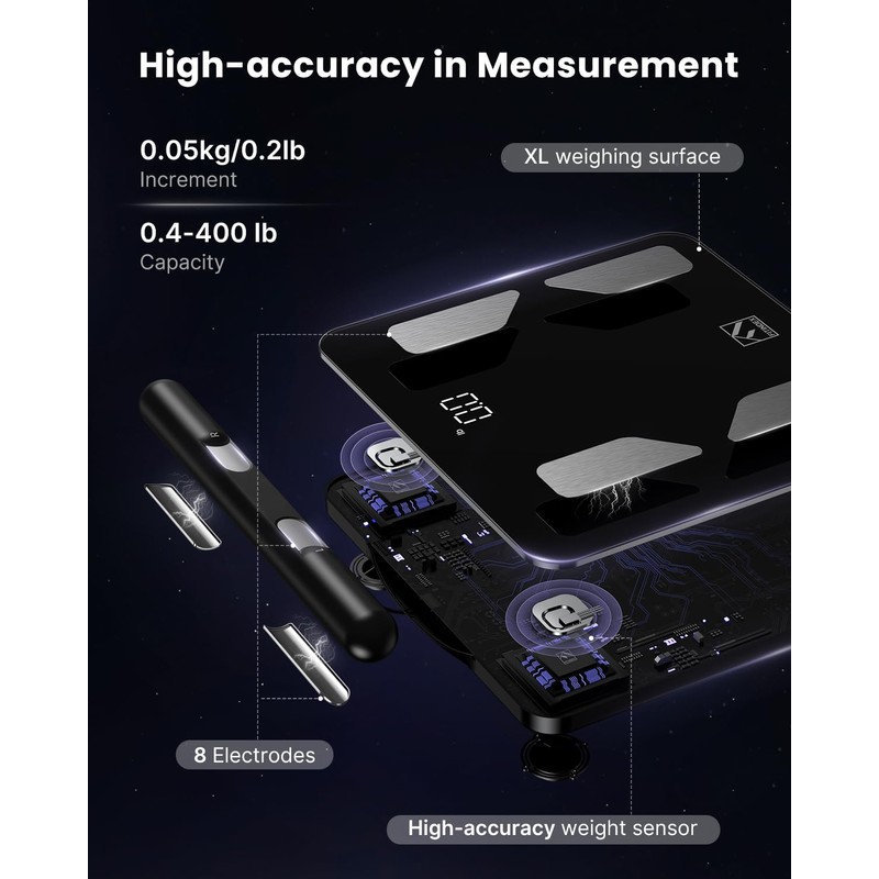 - [High Precision Measurements for Full Body] The Body Composition Scale utilizes an 8-electrode technique for segmental BIA, comprehensively measuring five segments of your body (four limbs and torso) using double frequency. Equipped with eight high-precision sensors, this body weight scale accurately tracks weight with a 0.2 lb accuracy and supports weights up to 400 lbs. For accurate results, please read the instructions carefully before use. Maintain the correct posture during the measurement process (FSA / HSA eligible)