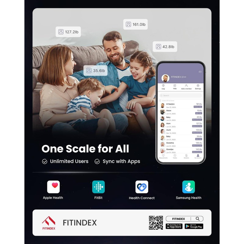 - [Unlimited Users] The FITINDEX app allows you to create more than 30 user profiles, managing each user's data individually. It enables data sharing with Apple Health, Fitbit, and Samsung Health, and is compatible with Apple Watch. The FSA / HSA eligible scale and body fat analyzer help you conveniently monitor your physical condition