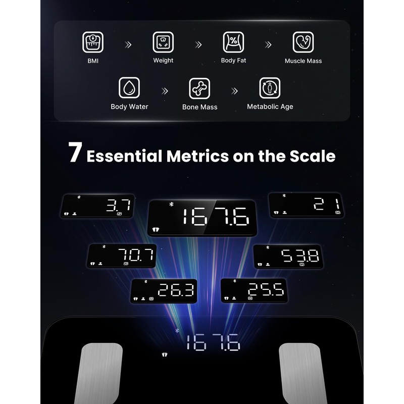 - [50 Body Composition Analyzer] Smart scale shows not only weight but also BMI, body fat, muscle mass, fat-free body weight, subcutaneous fat, visceral fat, body water, protein, skeletal muscle, BMR, bone mass, protein and metabolic age by electrical Bio-Impedance Measurement Technology. Meanwhile, weight scale with body fat and muscle also has 5-segment muscle and fat analysis and multiple site circumference data