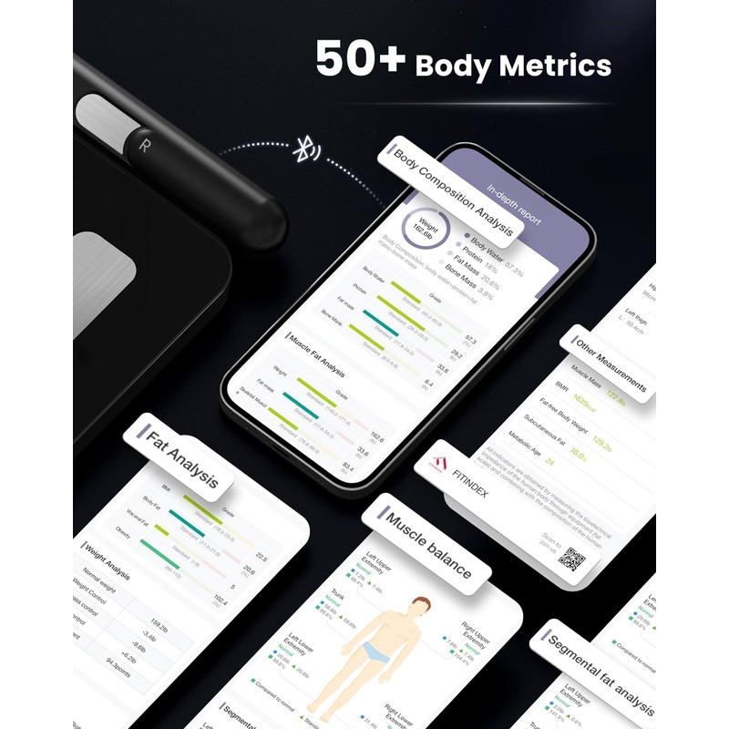- [Track Progress Easily] The FITINDEX app generates a comprehensive body composition analyzer report, accurately detailing index data for each part of your body. With this information, you can tailor exercises and diet plans to improve arm strength, abdominal muscles, thighs, and overall physical health. The app provides detailed charts and trends for 50 body composition metrics over weeks, months, or years, helping you track health and fitness goals with precision and convenience