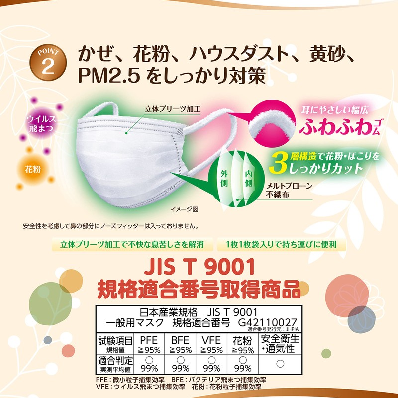 - Japanese Industrial Standards JIS T 9001 General Mask, Standard Conformity No. G42110027, Conformity Number: JHPIA