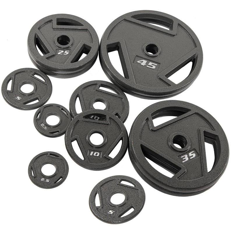 • Each plate has 3 large openings with strips on them for easy grip, labeled in both lb and kg for easy recognition.