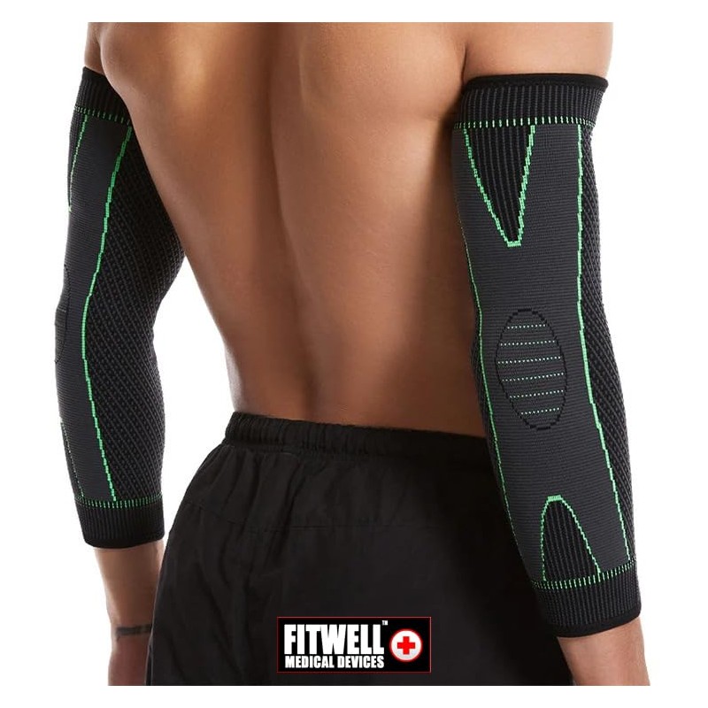 FITWELL Men's Elbow Compression Sleeves for Weightlifting & Body Building (2 Pack), Medical-Grade Injury Prevention and Elbow Support, Prevent & Heal Elbow Joint Tendonitis & Inflammation, Professional Gym Sleeves (Green, Small)