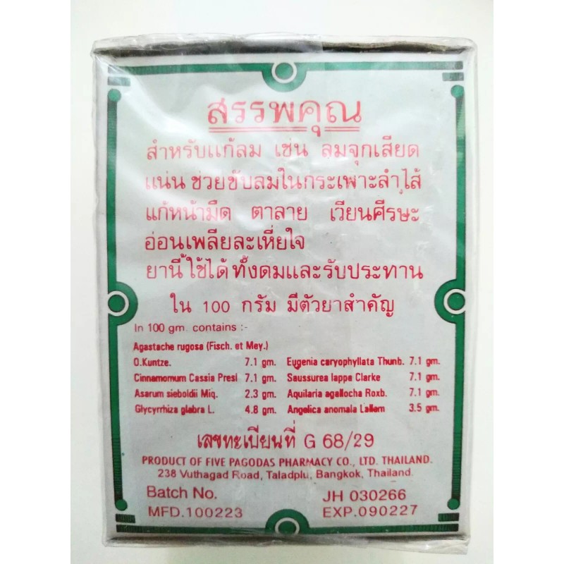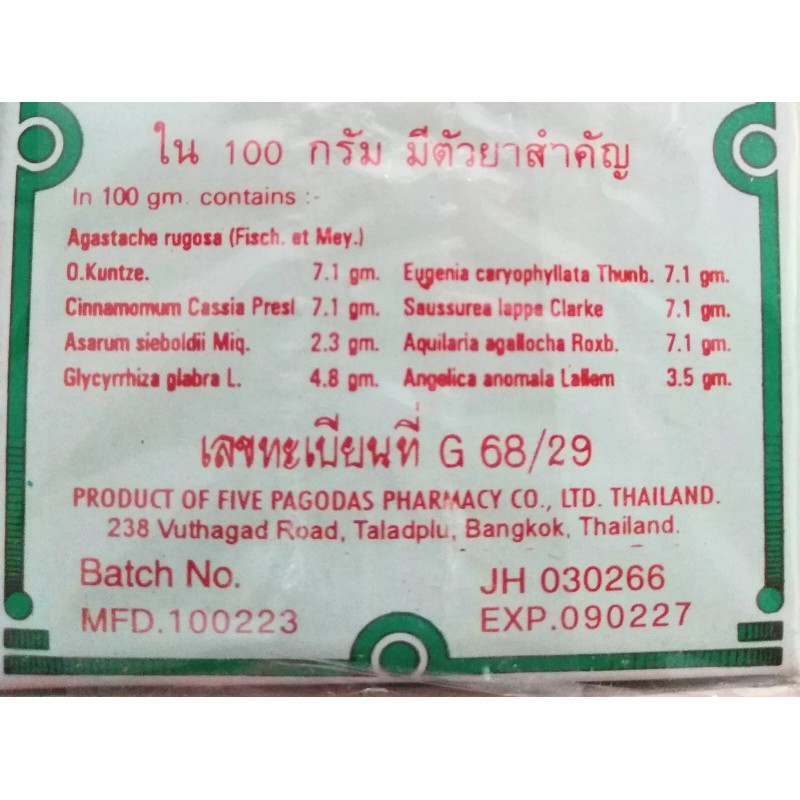 The Five Pagodas Ya Hom is sold in pharmacies throughout Thailand and is considered to be one of the most sort after remedies for most aliements for multiple conditions. Ya Hom is in compliance of the FDA registration # G68 / 49, it is a Dietary Supplement, not a drug.