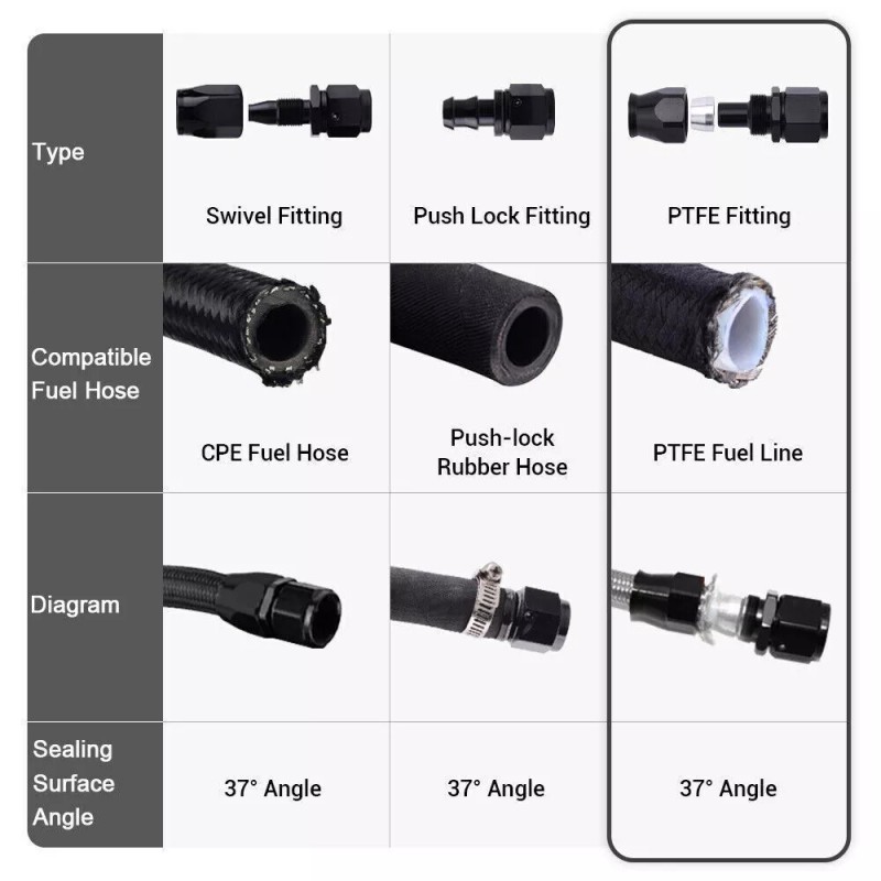 Apply to all oil/ fuel/ water/ fluid/ air/ gas line, specially for E85 ethanol gasoline. work with PTFE nylon or stainless braided hoses.