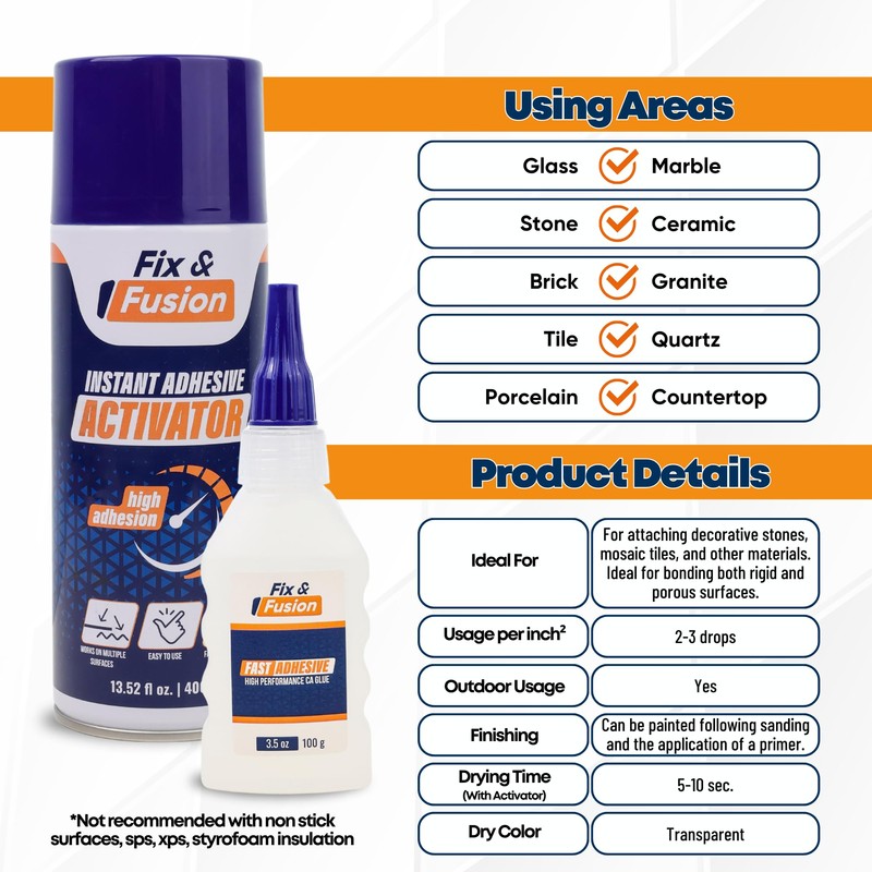 - Fast, Easy and Powerful: FIX & FUSION Super Glue and Activator set ensures a powerful, fast-acting bond that is easy to apply. For best results, make sure surfaces are clean, dry, and free of dust and grease. Spray the activator from 20 cm away, holding it upright, and wait 5 seconds. Then apply the super glue to the other surface and press them together. Bonding occurs within 10 seconds at 20°C, giving you reliable results for all your repair and crafting needs.