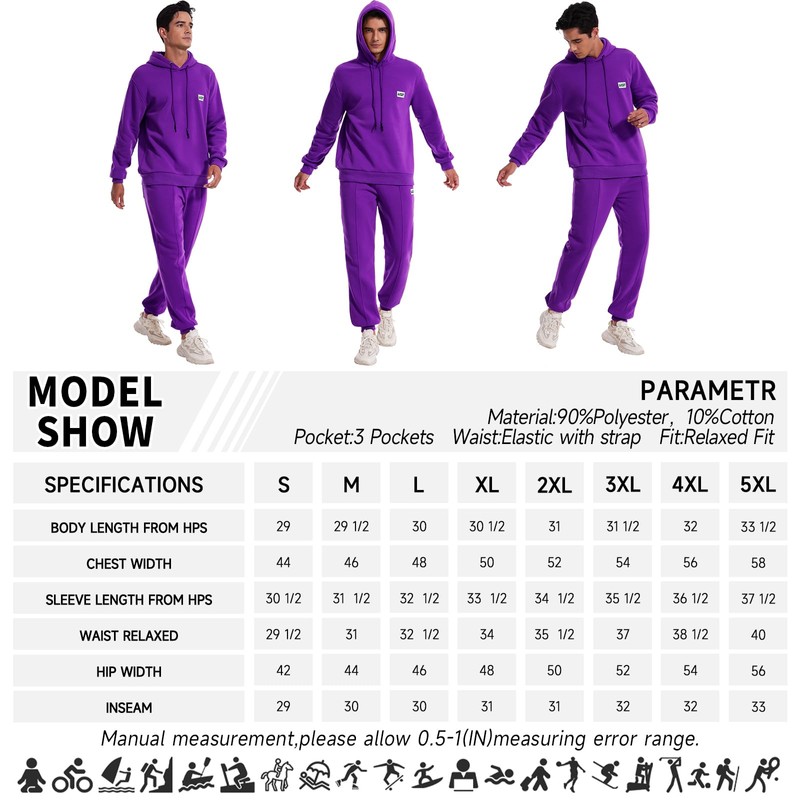 - FLEECE TRACK SUITS MEN:Both track pullover hoodies and sweatpants 2 piece workout outfits are crafted from a blend of polyester and cotton,ensuring cozy and breathable,long sleeve and roomy fits gives you some extra space through your chest, body and hips for easy comfort and layering